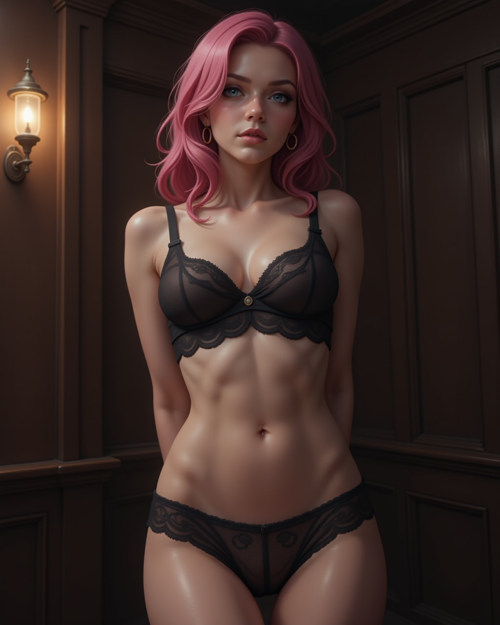 ピンクの髪で曲線美のある女性が、濃い霧に包まれた豊かな森の前に、大きな装飾的な金の楕円形の鏡の前に立っている。赤いレースの下着を着用。肌は白く、青い瞳で、誘惑的な表情で観客を見つめている。黒い太ももまでのストッキングを履き、首にはチョーカーを着用。背景には高い木々と濃密な葉があり、前景にはピンクのユリが咲いている。光は柔らかく神秘的で、不思議な雰囲気を生み出している。スタイルは非常に詳細でリアリスティックで、女性の曲線と下着の繊細な細部に焦点を当てている。