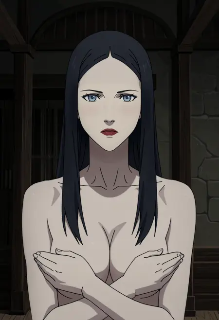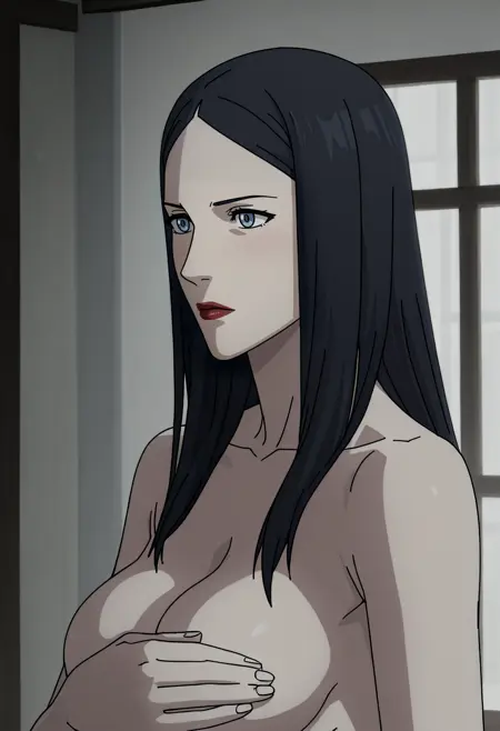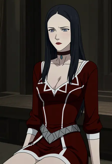 tetragil, 1girl, long hair, black hair, straight hair, light-blue eyes, red lips,
