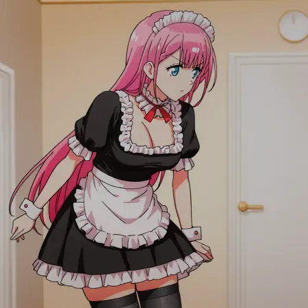 • 女仆服装触发词:KirisuMaid, 1girl, 粉色头发, 女仆头饰, 长发, 中等胸部, 黑色过膝袜, 蓝眼睛, 挺胸, 女仆围裙, 花边, 手腕袖口, 穿着女仆装, 连衣裙, 牛仔镜头
