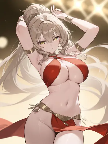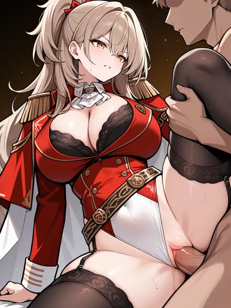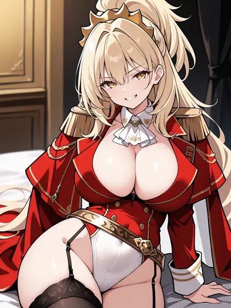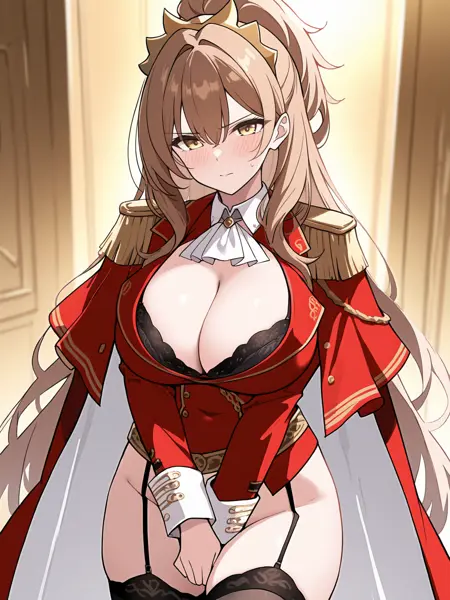 주요 복장: 금색 왕관, 빨간 재킷, 긴 소매, 가슴 노출, 검은 브라, 레이스 장식 브라, 브라 노출, 흰색 리오타드, 가슴끈, 검은 허벅지 스타킹, 어깨장식, 노란 벨트, 흰색 애스콧, 망토