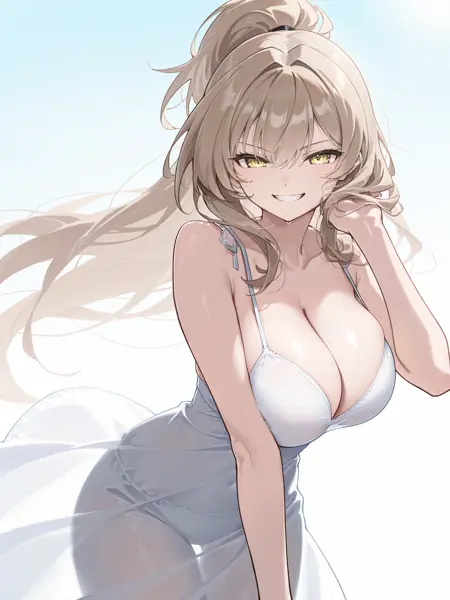 외모: 아줄리오, 매우 긴 머리, 연한 갈색 머리, 노란 눈, 높은 포니테일, 큰 가슴