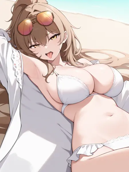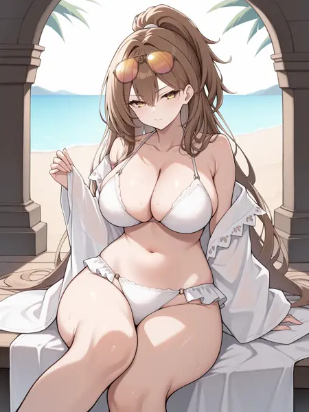 비키니: 머리에 선글라스, 틴트된 안경, 흰색 비키니, 레이스 장식 비키니 상의, 주름진 비키니 하의, 흰색 로브 (가끔 "O-링 비키니 하의"를 추가하는 것이 더 낫지만 항상 필요하지는 않음)