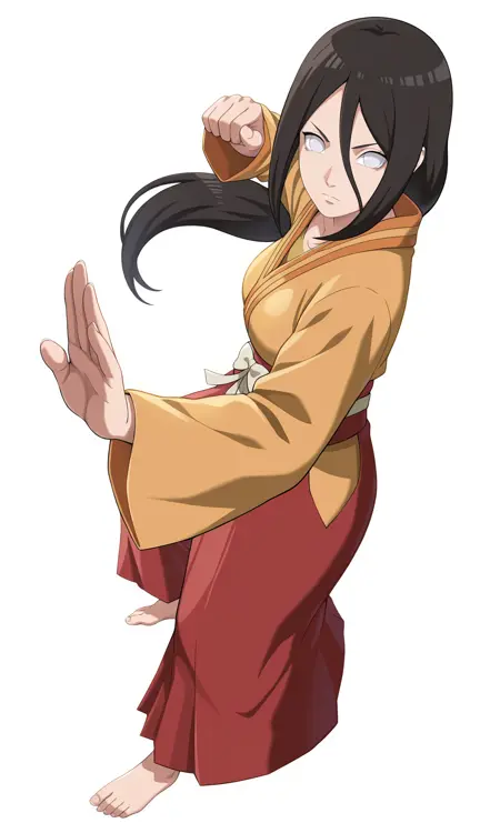 hanabihyuuga, white eyes, low ponytail, long hair, yellow kimono, ribbon, hakama skirt, sandals,
