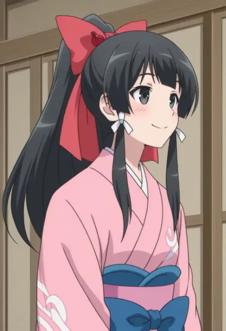 트리거 = zzyaekokonoezz, 태그 = 1girl, 일본 복장, 검은 머리, 긴 머리, 헤어 리본, 기모노, 분홍 기모노, 솔로, 단발, 검은 눈, 미소, 빨간 리본, 헤어 튜브, 블러시,
