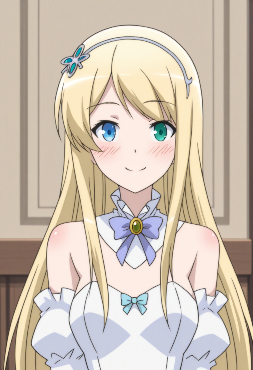トリガー = zzyuminaurneazz、タグ = ブロンドヘア、ロングヘア、虹彩異色症、青い目、緑の目、1girl、肩出し、ヘアバンド、シングル、ドレス、ほほ紅、笑顔、外れ袖、白いドレス、髪飾り、外れカラー