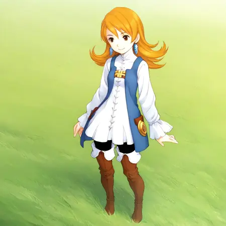 Refia suffers from having a true mess of training data, even compared to the much more obscure characters I’ve done before, which is likely why nobody else has done her without synthetic data yet: Loads of styles with their own distinct differences in design (her hair color is all over the place, and the 3D intro has straight hair), a large chunk of the data is chibi, she’s frequently seen in alternate costumes, and the best stuff is 3D. A true “dog’s lunch” of a training data set that I’m surprised works as well as it does (clasps (?) on the dress appear to be pretty inconsistent though). The benefit, and negative, of having this varied a dataset however is that she has low "inherent style" so she'll come off kind of generic on her own, but pairs well with any style you stick her in.