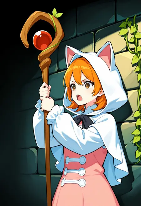 従順者: D_U_S、猫のフード、フードをかぶった状態、黒いネックボウ、白いフード付きキャップレット、ピンクのドレス、白いスリーブ、太ももブーツ、折り返しブーツ(この衣装は膝を覆わないスカート/ドレスと同様、腰より下のビューがランダムにPG-13レーティングを受ける可能性があることに注意)