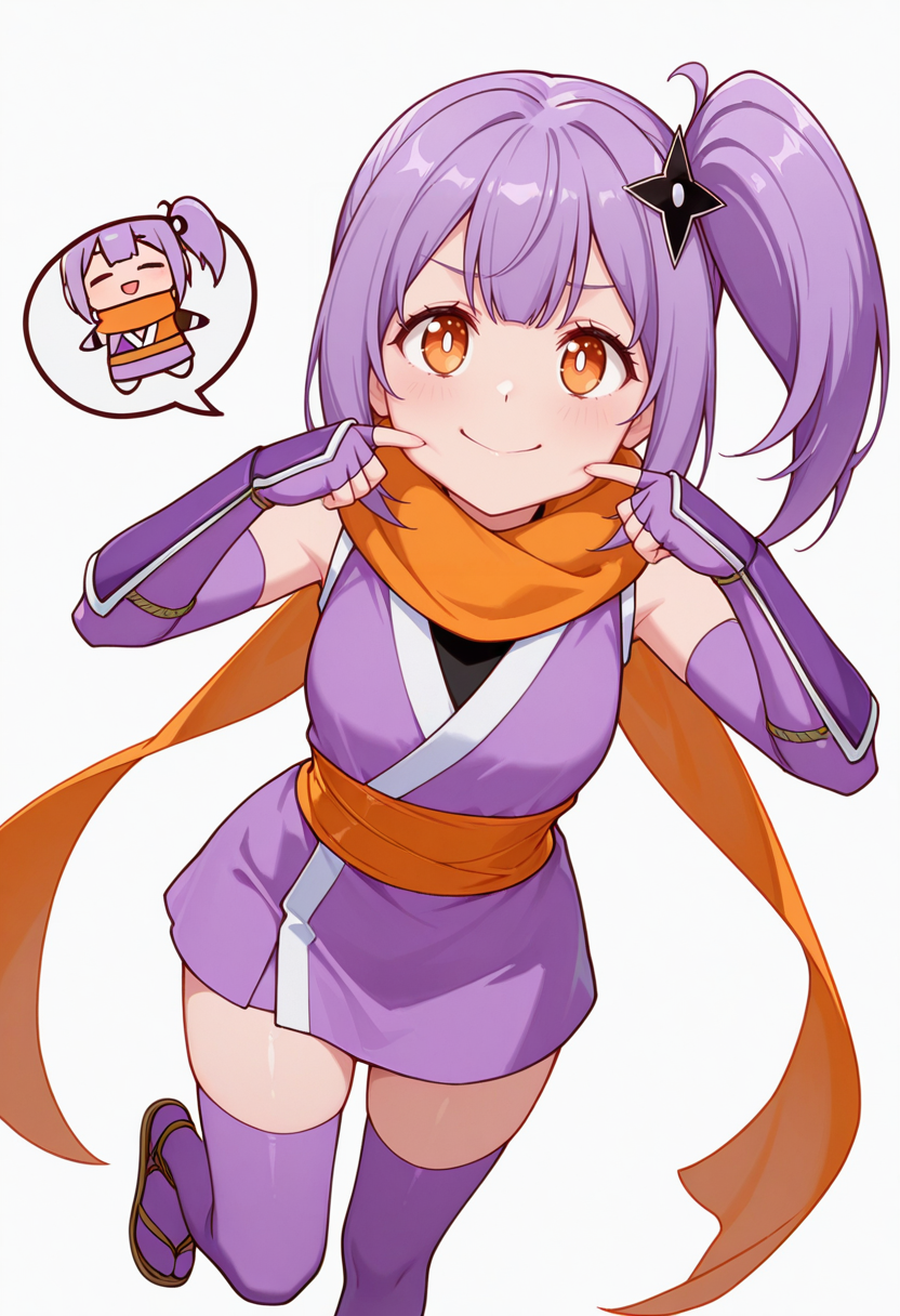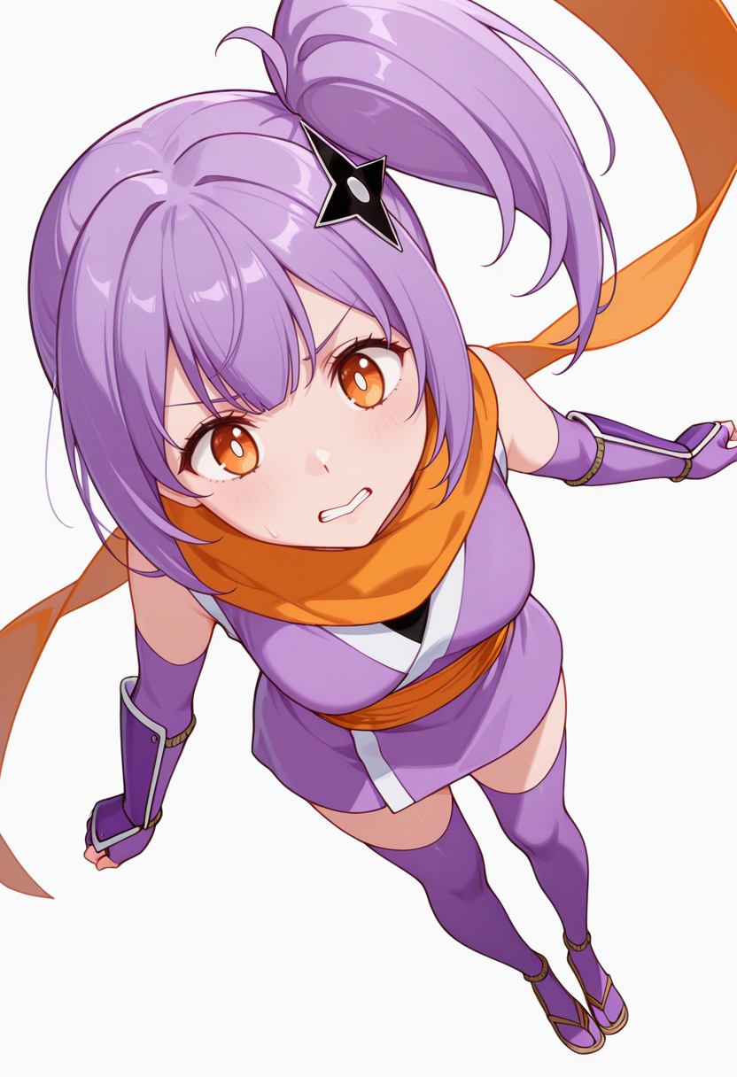 satoko_s1, ninja, japanese clothes,short kimono, sleeveless, sash, scarf, purple thighhighs, sandals, fingerless gloves, elbow gloves,