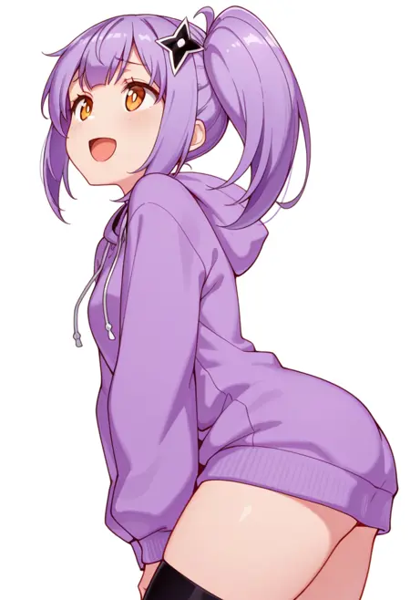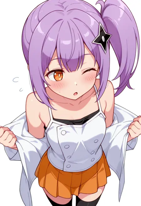 satoko_cnr, 1girl, purple hair, long hair, side ponytail, bangs, orange eyes,hair ornament,