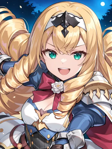 衣装: 黒いアーマードレス、青色の詳細、トップカットアウト、アーマードレスの下の白いドレス、ピンクの詳細、白いヘアバンド、黒い頭部装飾、ゴールドの詳細、胸元の開き、アルトブルーの袖、アルトふくらはぎ袖、花が付いたリボン、白い花、片側パウルドロン、ガントレット、単一の白ピンクキャップ、片肩キャップ、ピンクのクロスベルト、装飾されたスカート、茶色のパンタイツ、白い膝上ブーツ、ローヒール、