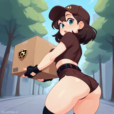 | 학습된 단어 | USPgirl, dark brown hat with gold badge emblem, skin tight dark brown cropped short sleeve professional shirt with a gold badge emblem, cleavage, skin tight dark brown lowleg micro shorts, black fingerless gloves, belt, over knee black socks, boots, skin tight clothes, dark brown clothes, bare thighs, midriff, 복사됨! holding a cardboard box,복사됨! |