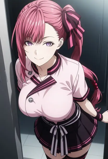pink hair, long hair,side ponytail,hair ribbon,purple eyes, pink sh1rt,black pleated sk1rt,