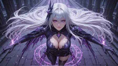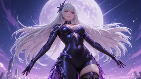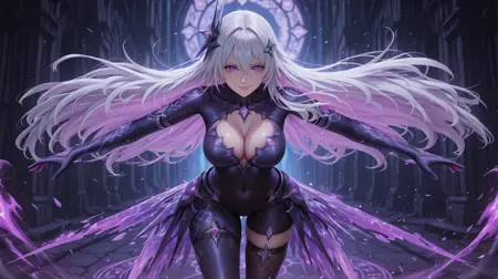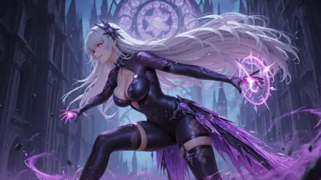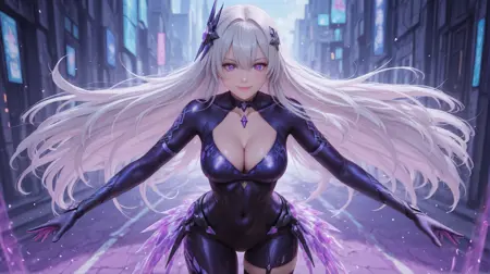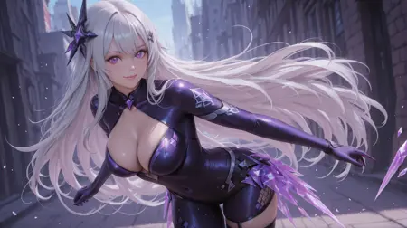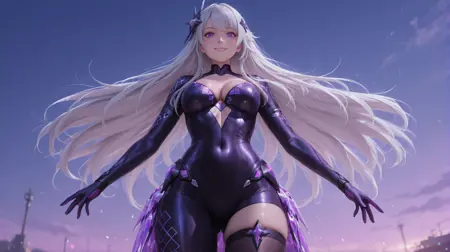 Nemesis,1girl,long hair,solo,purple eyes,covered navel,grey hair,hair ornament,very long hair,cleavage cutout,bodysuit,asymmetrical legwear,clothing cutout,thighhighs,