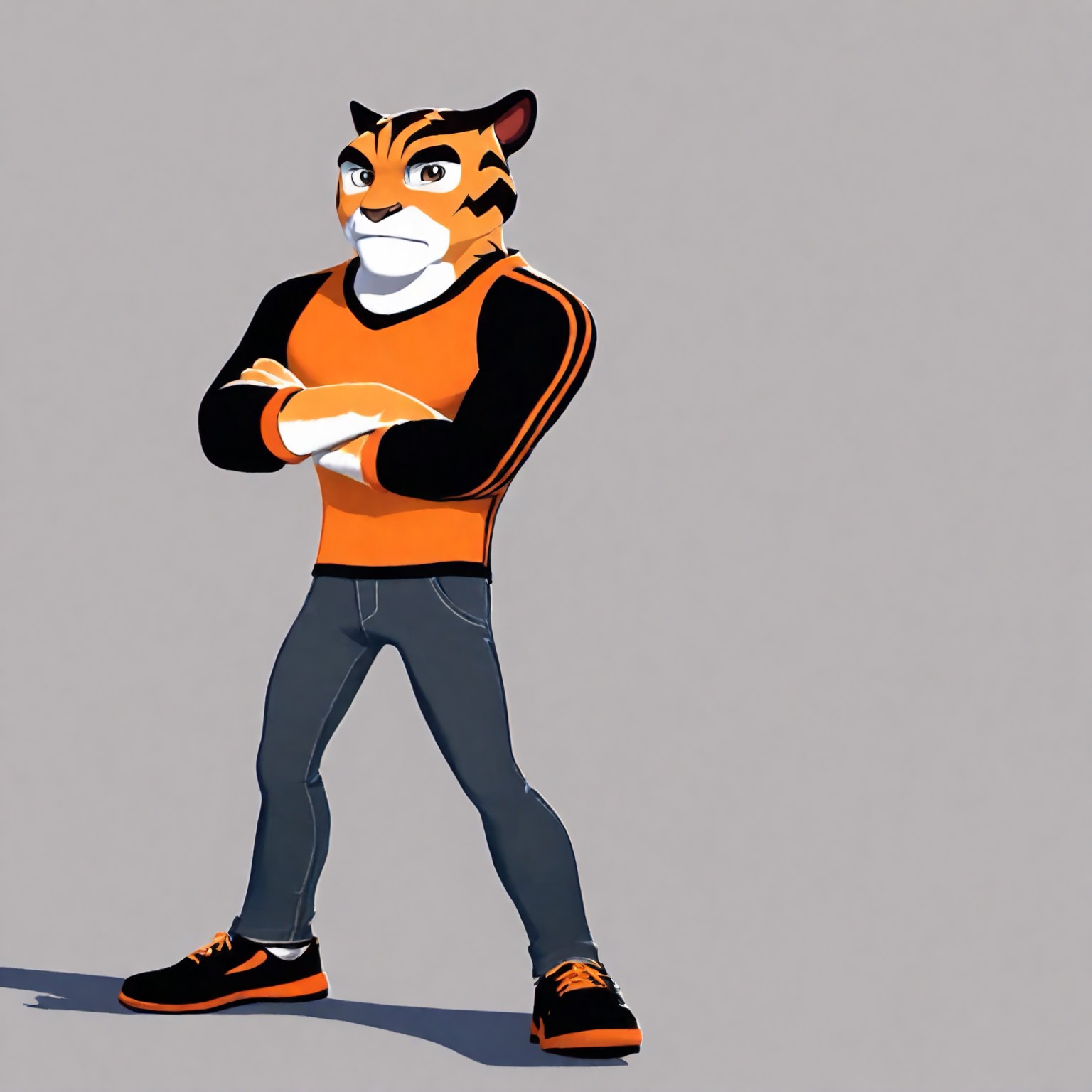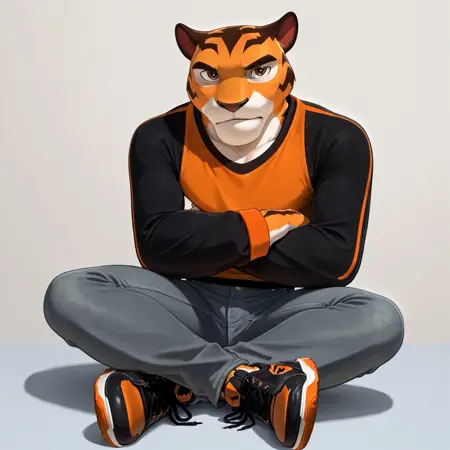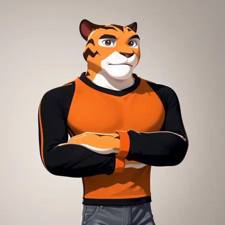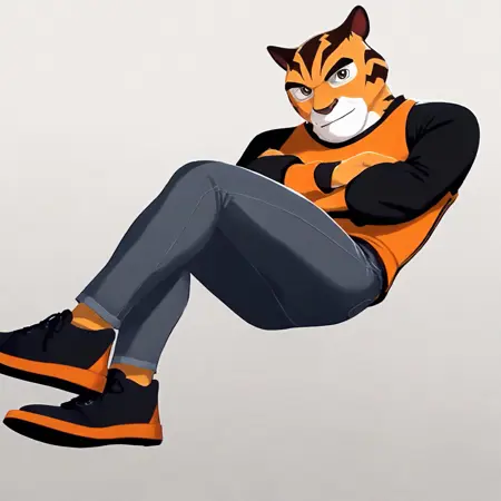 | Trained Words | Tag, tiger boy, furry male, tiger ears, brown eyes, multicolored fur, white patches around eyes, white area on lower face that extends down neck, white palms, orange fur, brown stripes, thick eyebrows, blunt brown nose, tall, muscular, full body orange jumpsuit, black sides on jumpsuit, black and gray sleeves, black fingers on glove portions, logo emblazoned on the left breast and shoulder, grey jeans, orange shirt, black sleeves, orange stripes that run down from shoulders, orange cuffs, black shoes with orange soles,Copied! |