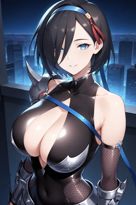 为呈现她典型的外观,请添加 "发带、黑色紧身衣、盔甲、露出胸部、裸露肩膀、胸部切口、分离袖子、渔网袜、护腕、黑色手套、黑色过膝袜、吊袜带、装甲靴"。