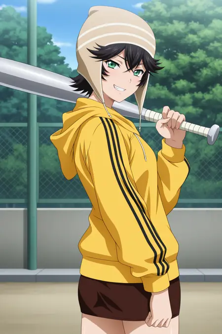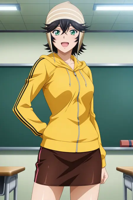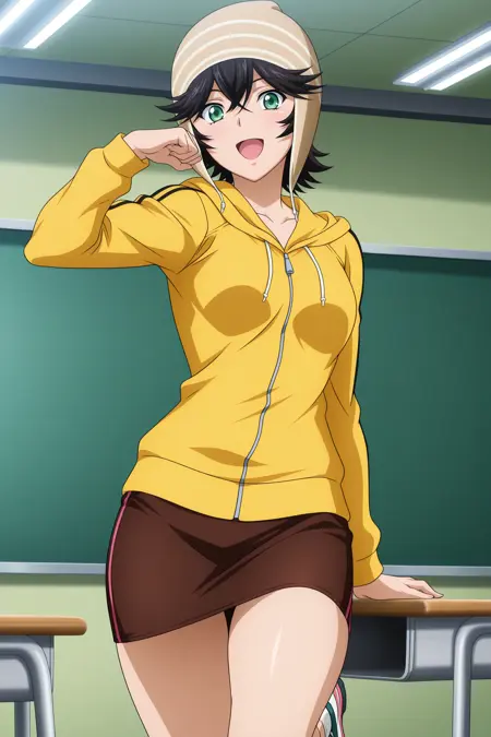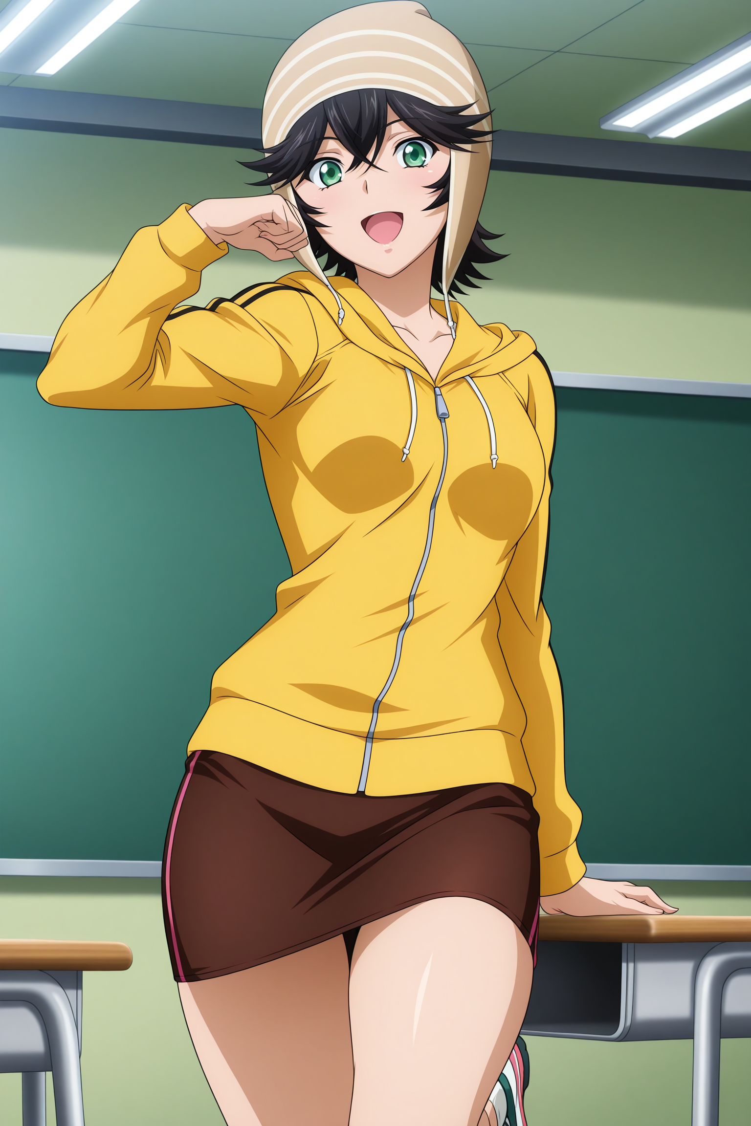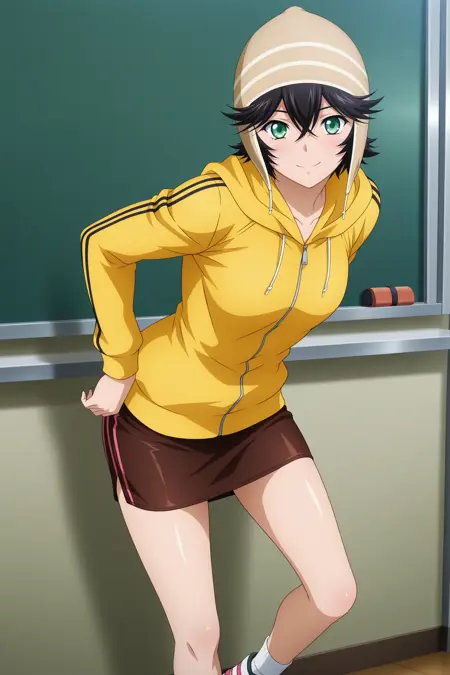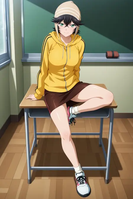 soujin shikou, short hair, black hair, hat, chullo, crossed bangs, green eyes, long sleeves, yellow jacket, hooded track jacket, brown skirt, pencil skirt, white socks, ankle socks, sneakers