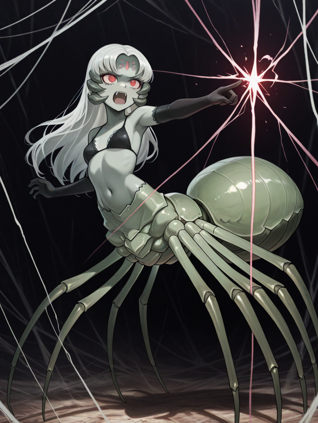 拉奇妮,白发,长发,红瞳,额头印记,尖牙,彩色皮肤,绿色皮肤,蜘蛛娘,节肢动物娘,半人马,蜘蛛半人马,阿拉克涅,比基尼上装,肘部手套,黑色比基尼上装,黑色手套