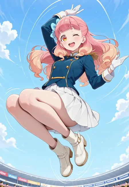 a1nelinkcoord, hairband, short sleeves,white gloves, boots, pink skirt,bowtie, pink_idol_uniform, pink jacket, pink skirt