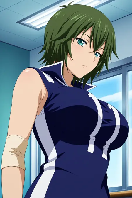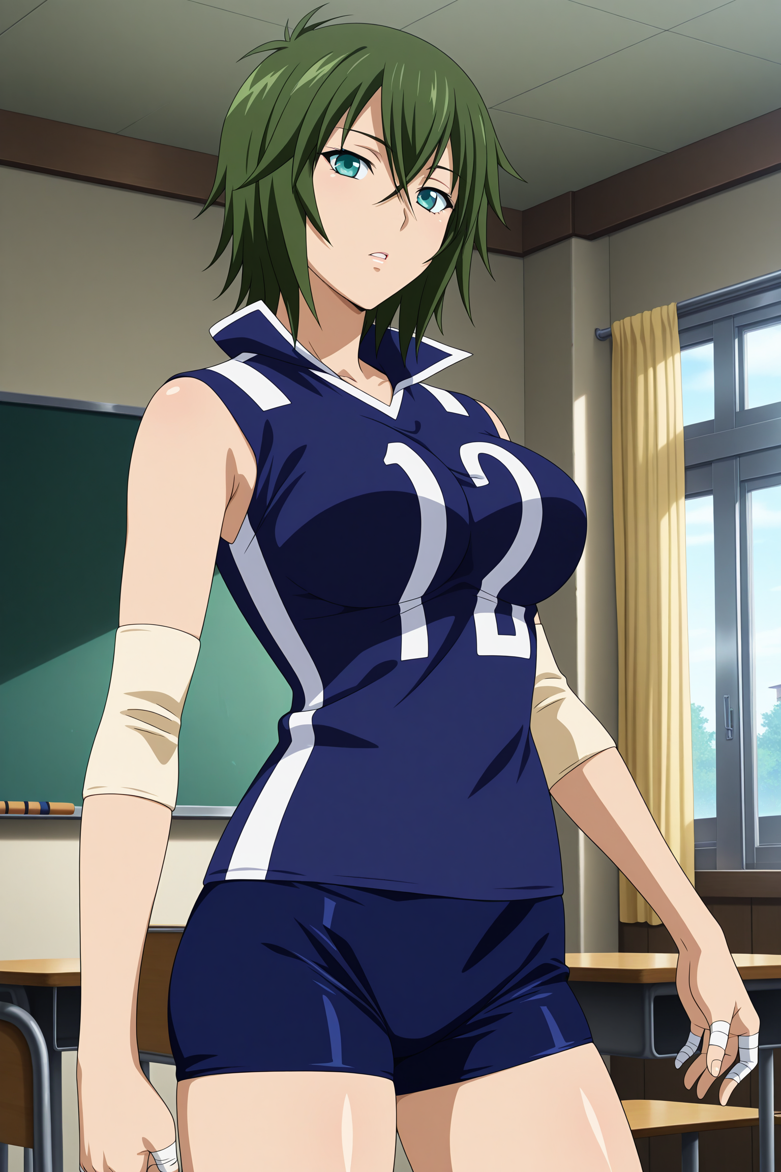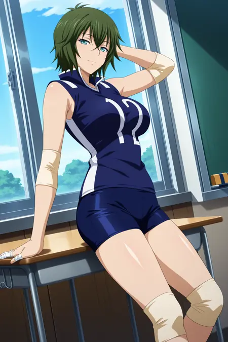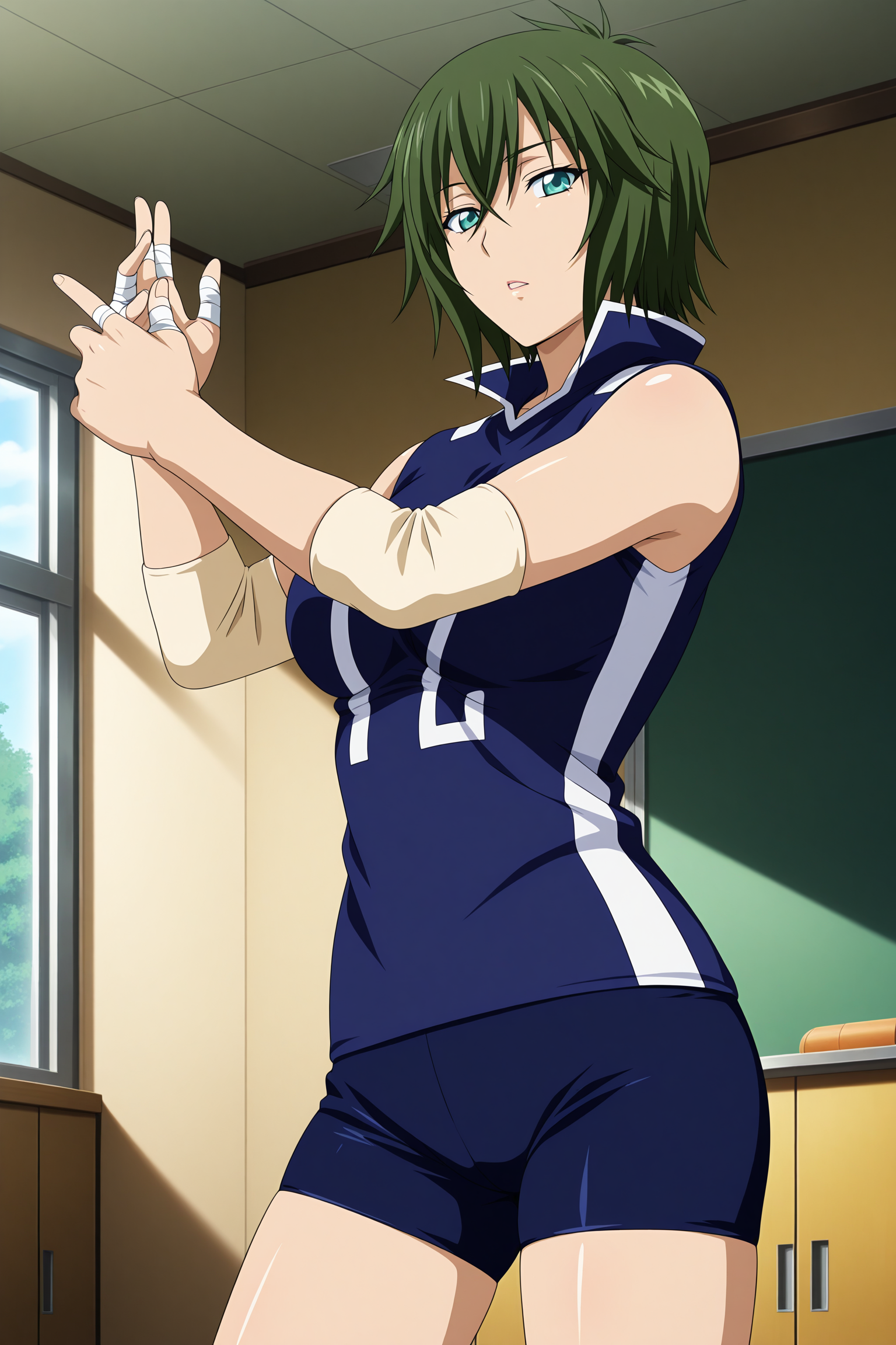 kyocho chuukou, short hair, green hair, crossed bangs, green eyes, sleeveless, volleyball uniform, blue shirt, high collar, bandaged fingers, elbow pads, blue shorts, bike shorts, knee pads, white socks, ankle socks, sneakers