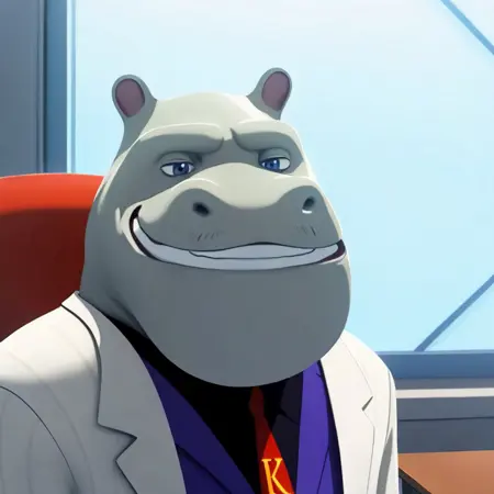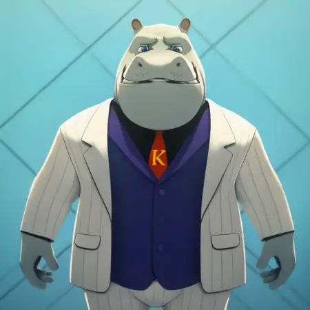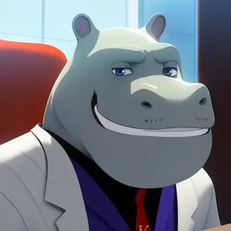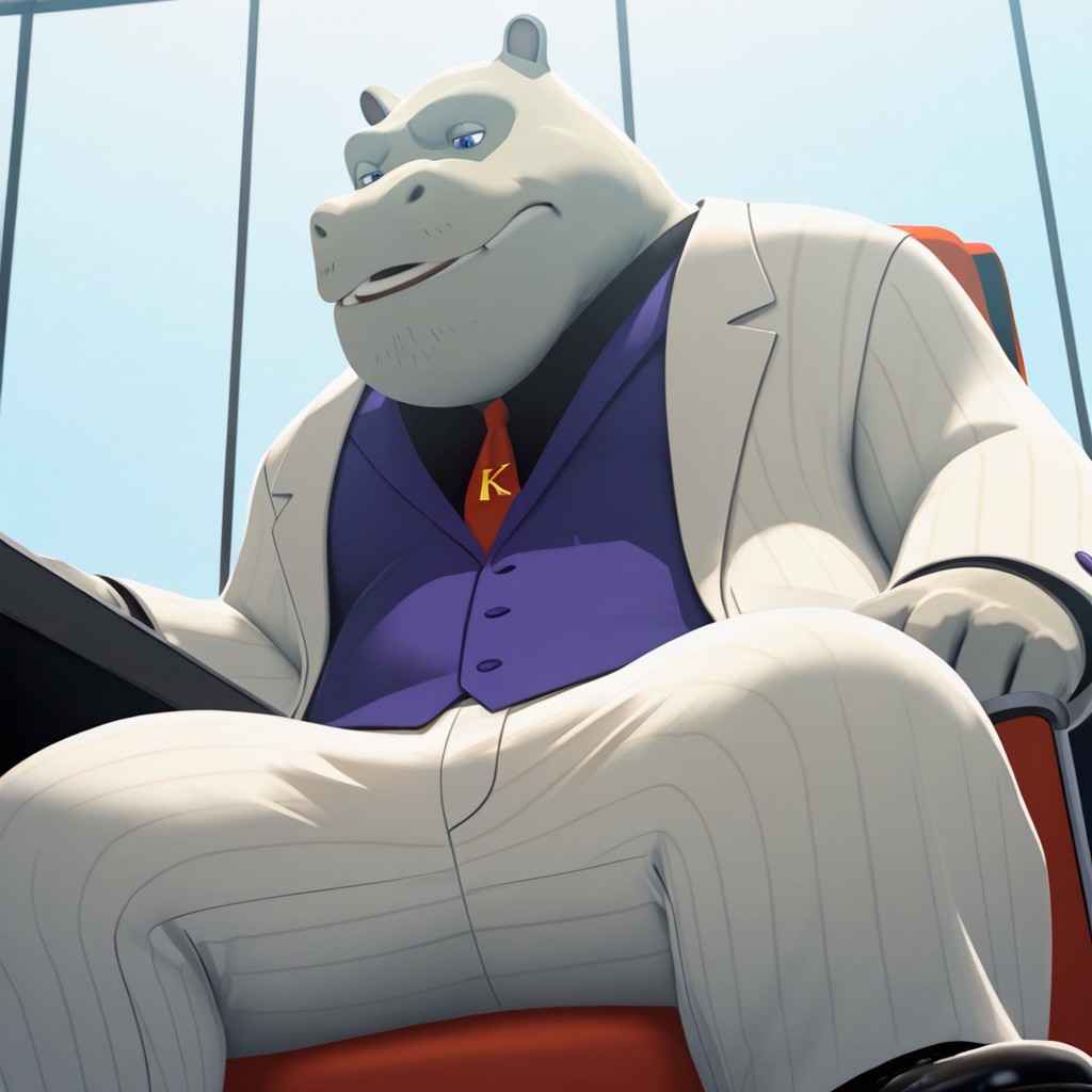 King, large humanoid, hippo, furry male, white pinstripe suit, red tie with the letter K printed on it, formal, black top, facial hair, blue eyes, purple vest, long sleeves, striped white pants, black shoes