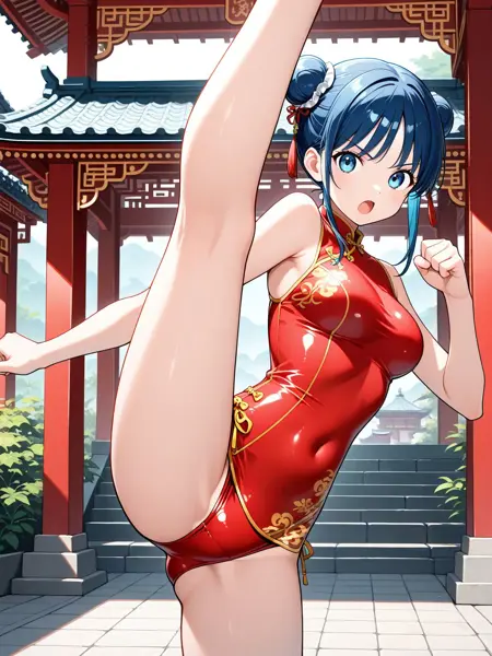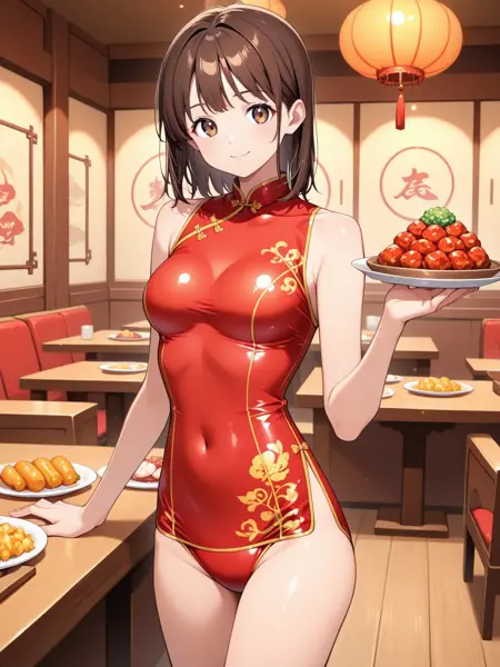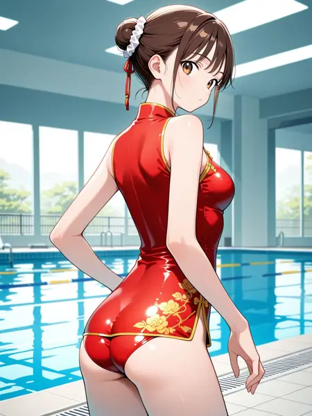 chinaswimsuit, chinese clothes, red one-piece swimsuit, swimsuit, one-piece swimsuit, side slit, bare shoulders,