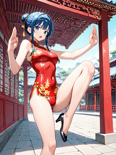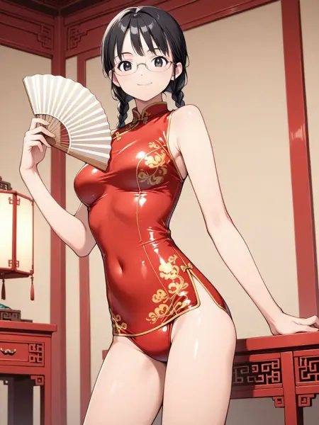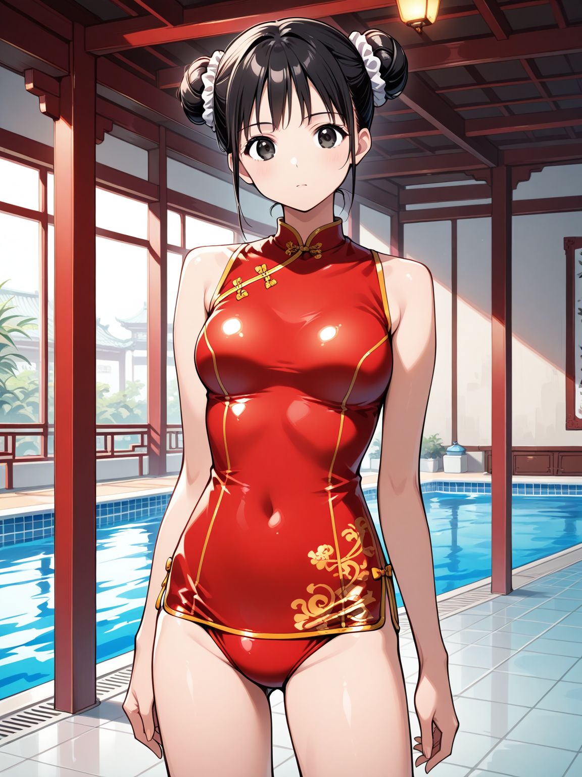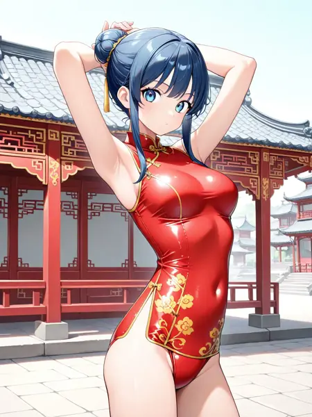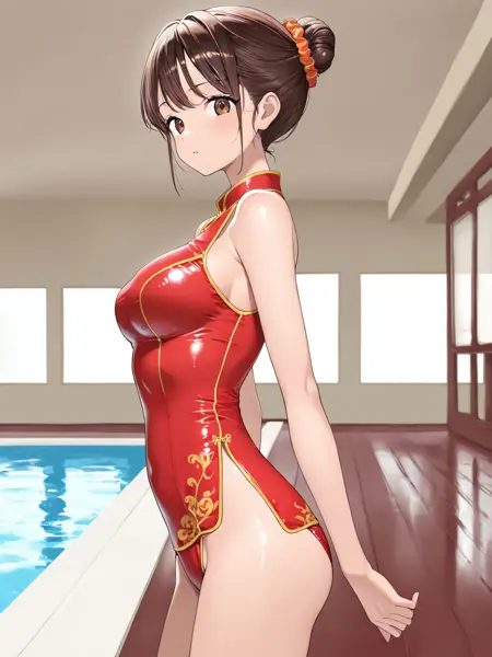 chinaswimsuit,chinese clothes,red one-piece swimsuit,swimsuit,one-piece swimsuit,side slit,bare shoulders,
