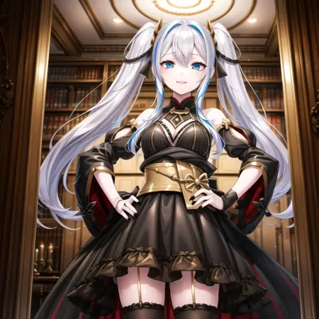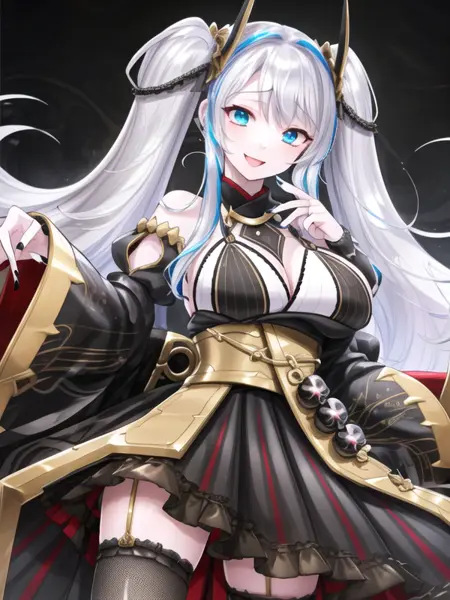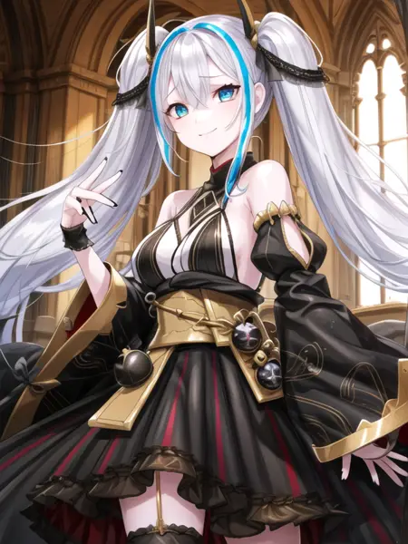 Urayodo,twintails, white hair,hair ornament, black nail, black dress,wide sleeves, black thighhighs,