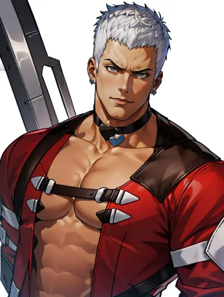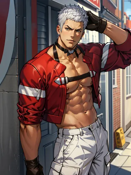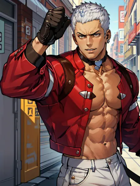 需要添加一些标签:心形项圈、矢野(KOF)、单人、看着观众、短发、手套、珠宝、白发、心形、敞开的衣服、黑色项圈、红色夹克、皮革、胸脯沟壑、招手