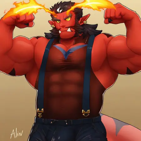 提示词为:健壮男性、山羊胡、恶魔男性、同性恋、AstarLAH、Astar、胸部纹身、肩部纹身、黄色眼白、蓝色眼睛、火之天线、耳环、胡须、红色身体、黑色油亮头发、白色呆毛、兽人牙齿、蓝色吊带、单人、 bara、杰作、高清、最佳画质,