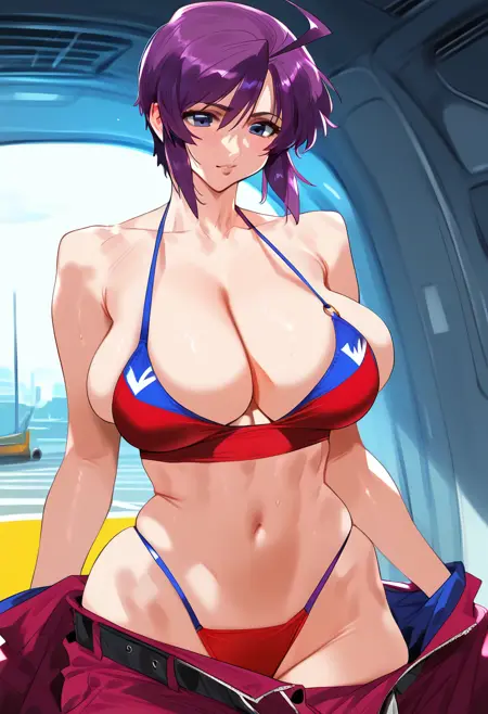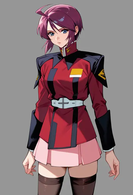 트리거: 룬마리아, 단발, 아호게, 보라색 머리 여자, 큰 가슴, 군복, 분홍 치마, 긴 소매, 허벅지 긴 양말