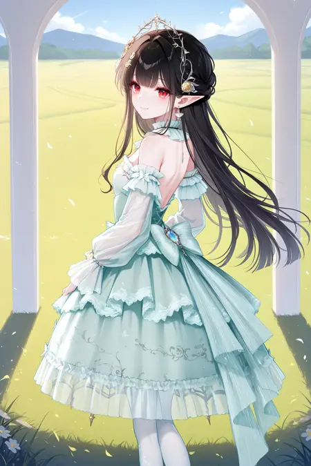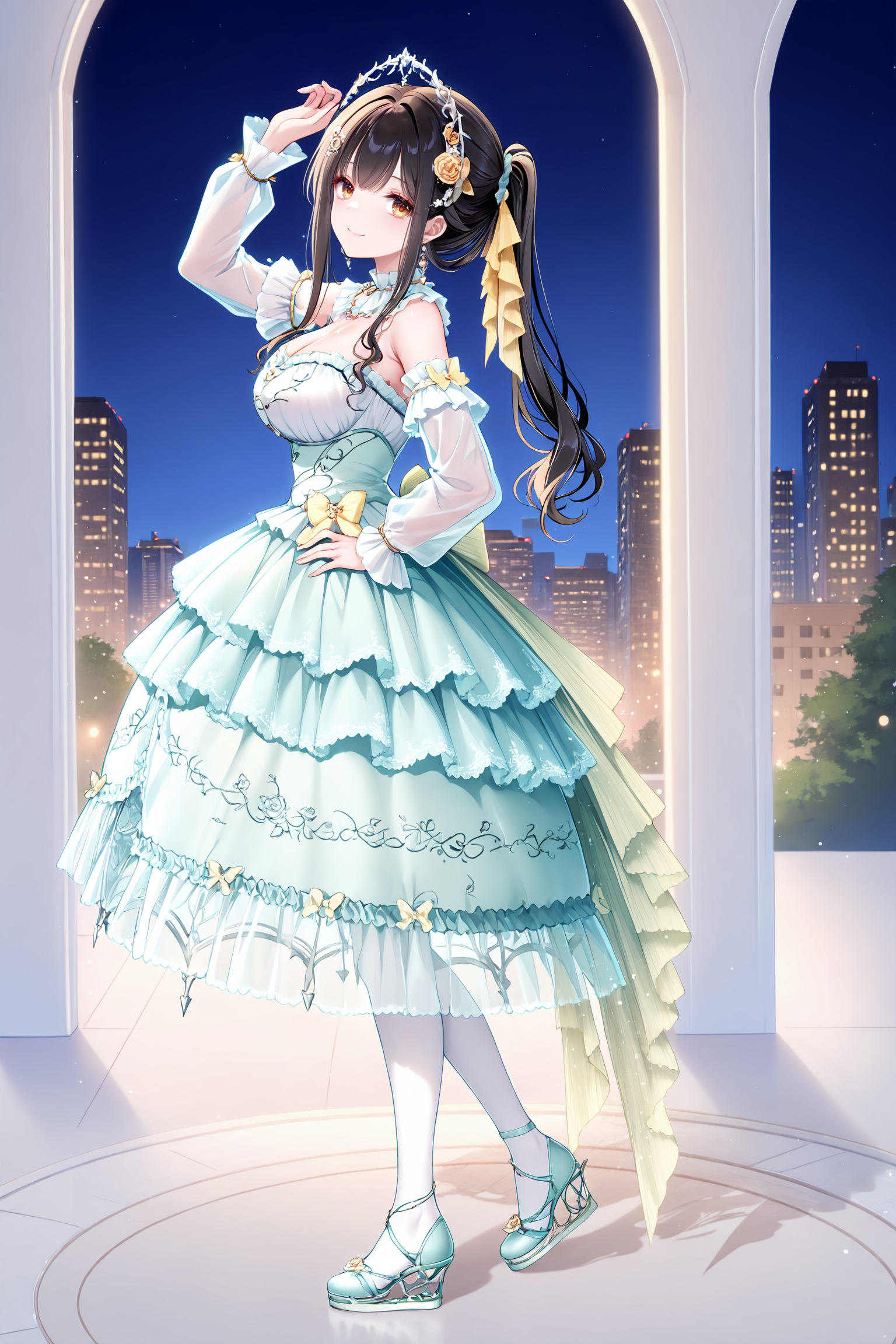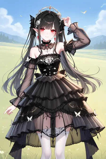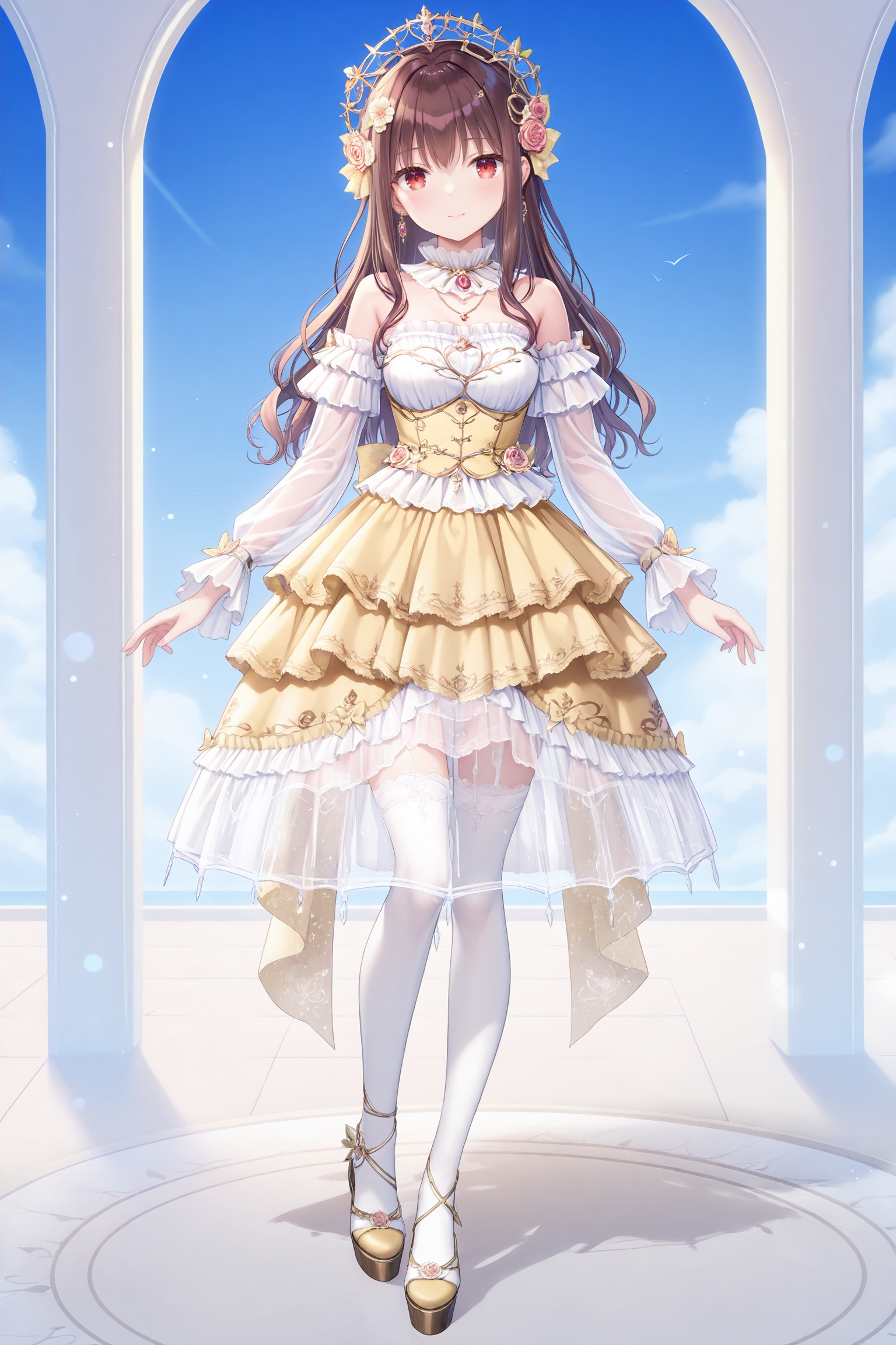 wishful aurosa,dress,earrings,see-through sleeves,detached sleeves,strapless dress,dress flower,white thighhighs,print thighhighs,frilled dress,see-through dress,