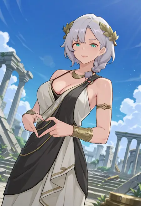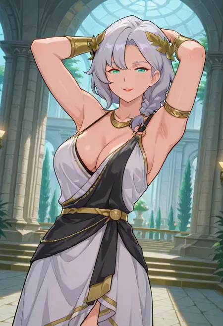 CaenisHSR, 1girl, solo, gray hair, short hair, bangs, braid, laurel crown, aqua eyes, lips, wrinkles, necklace, ancient greek clothes, large breast, cleavage, armlet, bracers, ancient greek dress, thick thighs, shoes, bare shoulders, white dress,