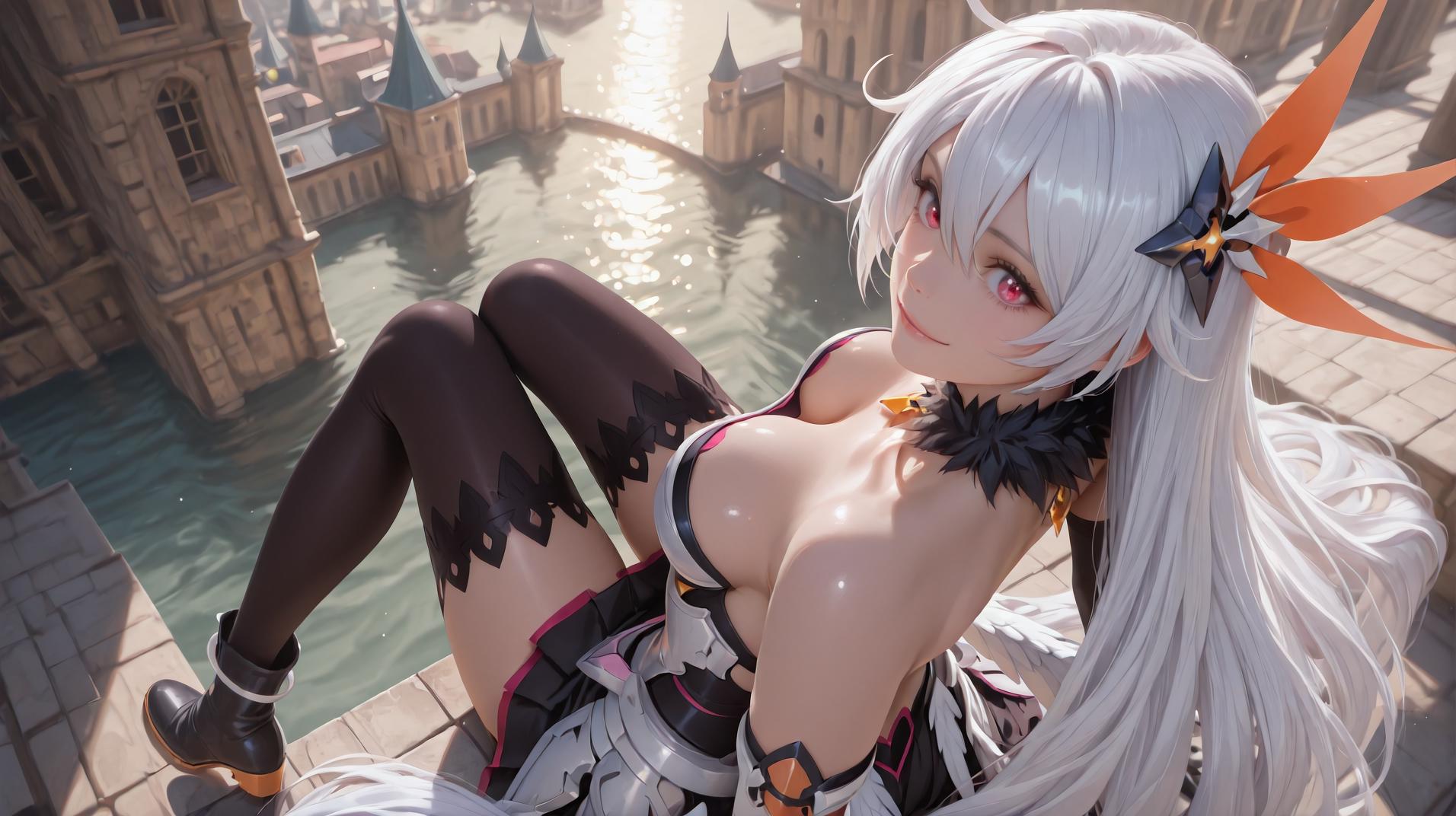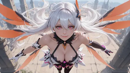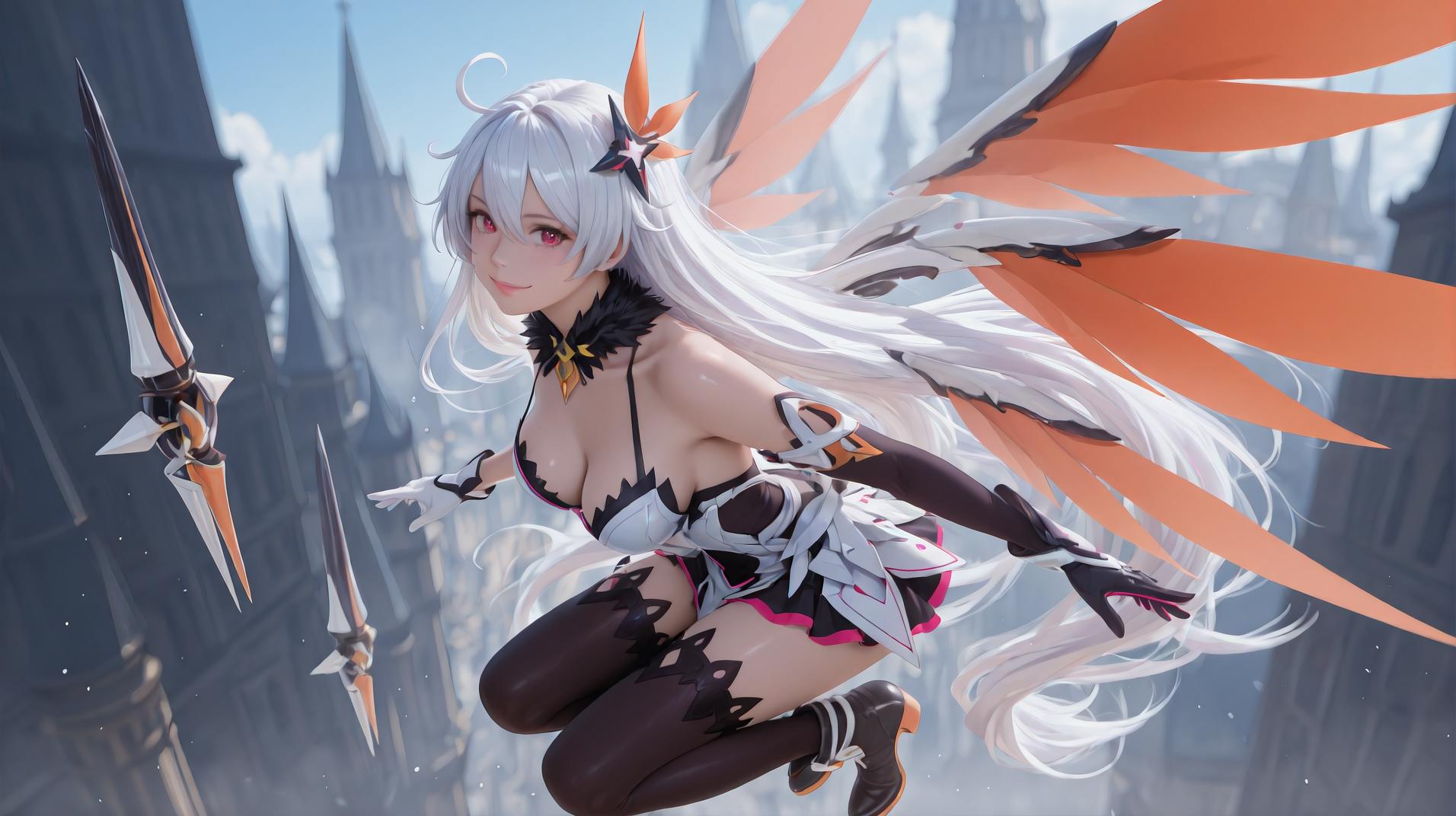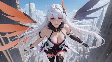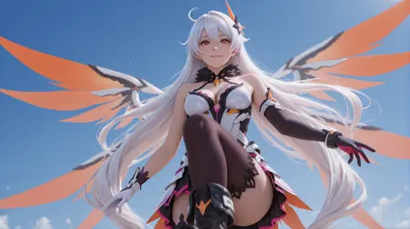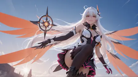 Kiana02,1girl,kiana kaslana,long hair,solo,boots,gloves,thighhighs,hair ornament,elbow gloves,red eyes,bare shoulders,single elbow glove,wings,asymmetrical gloves,black footwear,hair between eyes,white hair,mismatched gloves,fur collar,black gloves,antenna hair,very long hair,white gloves,armored dress