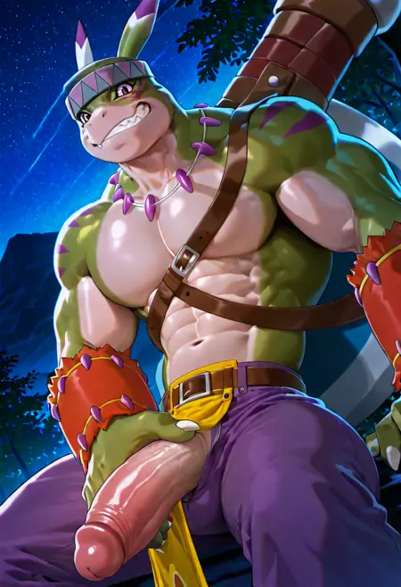 | 训练词汇 | Dinohumon,Purple Eyes,dinosaur boy,green reptilian skin,tribal clothing and armor,Wearing a purple and yellow loincloth with tribal patterns,purple leg guards with fringes,Headband with feathers and geometric pattern,red fur-lined bracers with jagged purple spikes and tribal decorations,tribal markings on his face and shoulders,已复制! |