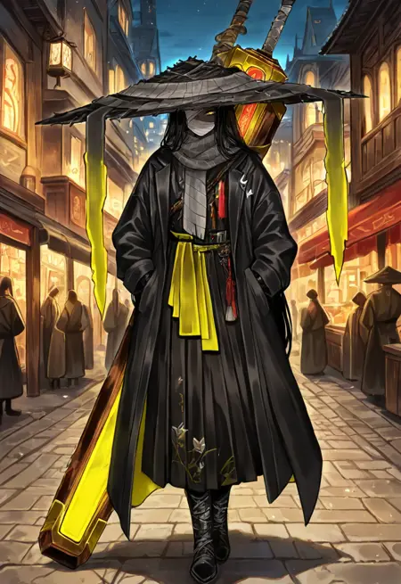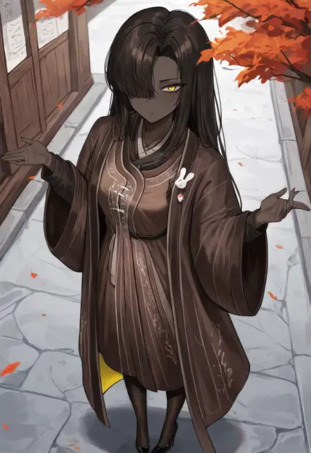 | トレーニングワード | very dark-skinned female, long hair, black hair, yellow eyesコピーしました! ZiluCasual, hair over one eye, blunt bang, dark brown hanfu, long hanfu, dark brown coat, open coat, wide sleeves, white bunny pin, black pantyhose, black shoes with heelsコピーしました! ZiluHeishou, covered face, bandages, bandage over mouth, bandage over one eye, bandaged head, black asian conical hat, grey scarf, black kimono, black hakama, black coat, open coat, belt, black clawed gloves, black bootsコピーしました! huge sword on backコピーしました! |