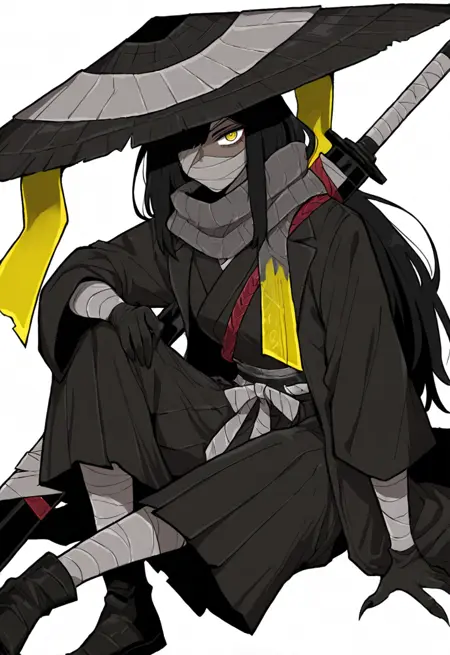 | 训练词汇 | dark-skinned female, long hair, black hair, yellow eyes, covered face, bandages, bandage over mouth, bandage over one eye, bandaged head已复制! black asian conical hat, grey scarf, black kimono, black hakama, black coat, open coat, belt, black clawed gloves, black boots已复制! |