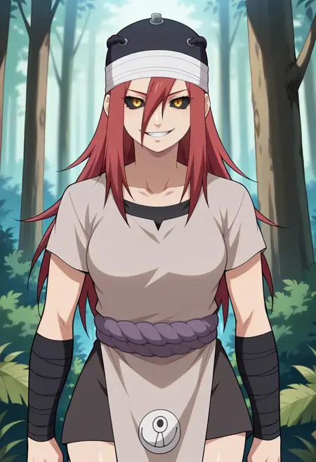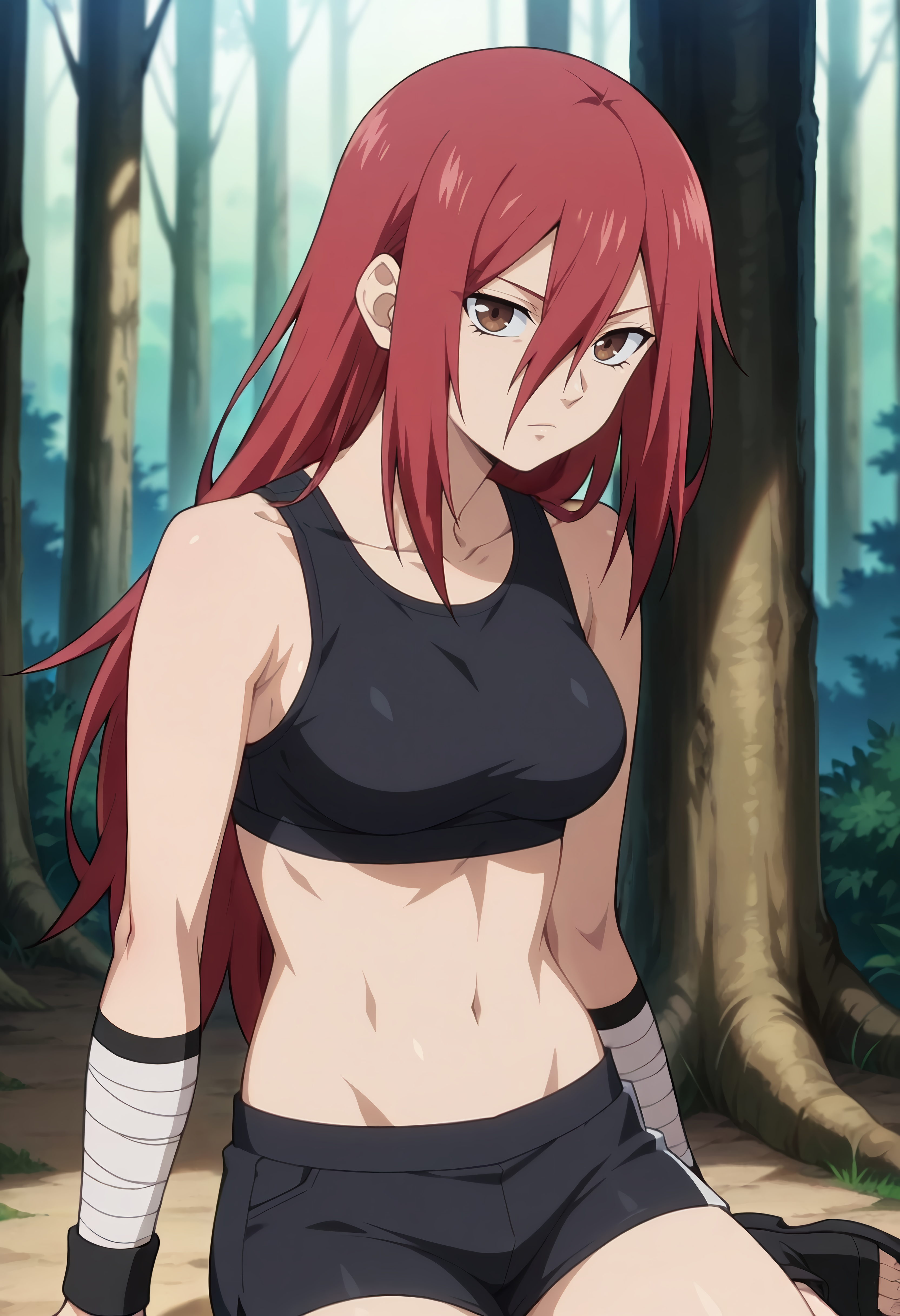 | 训练词汇 | htayuya, long hair, hair between eyes, red hair, bangs brown eyes, breasts,已复制! tunic,grey tunic,rope,short sleeves, pelvic curtain,已复制! black sport bra, black short, bandages, black armband, black footwear, toeless footwear,已复制! black sclera, yellow eyes,已复制! |
