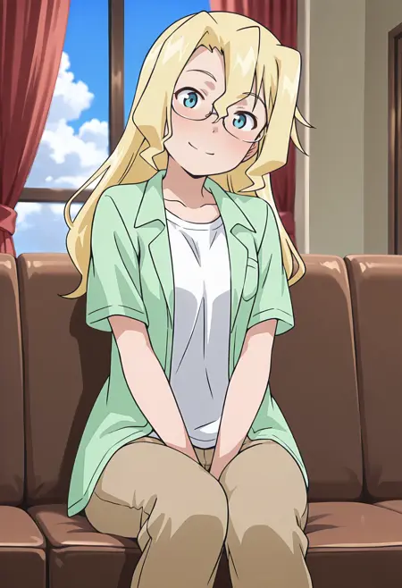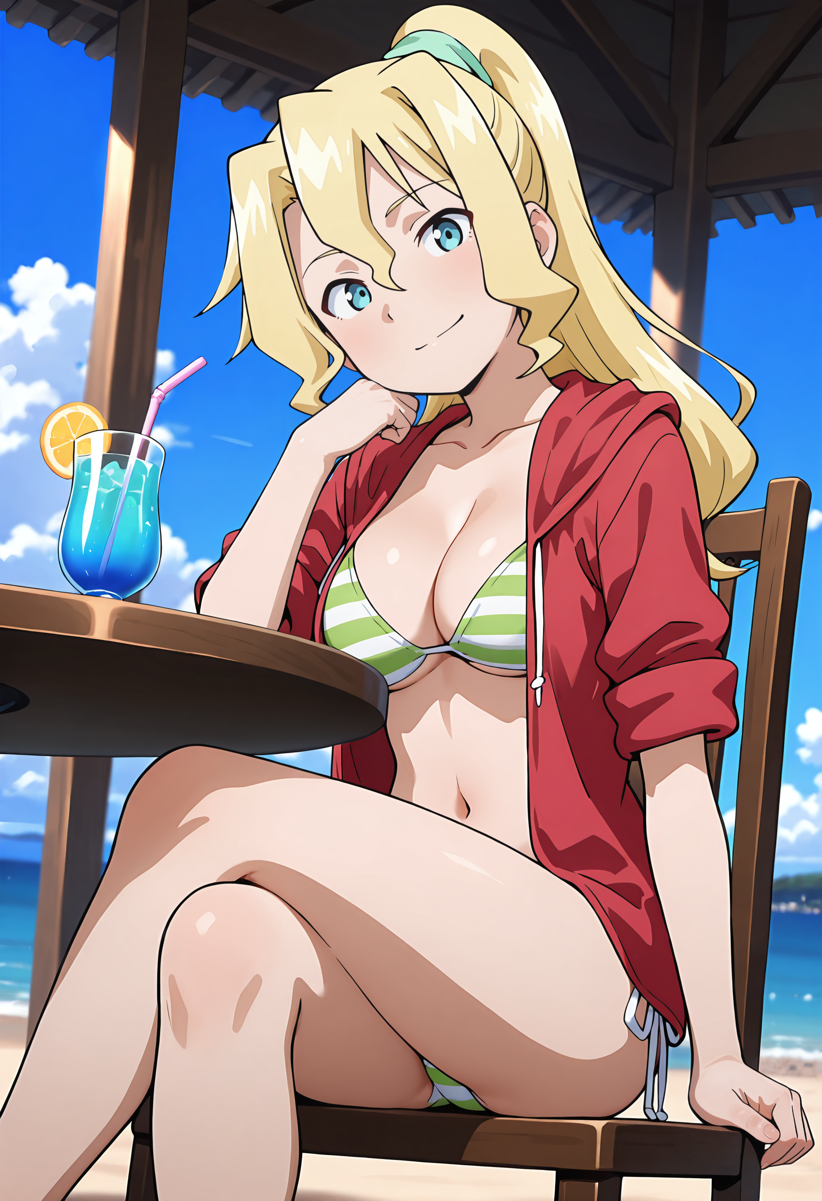 IkaCindy,蓝色眼睛,金色头发,长发,头发遮住眼睛,鬓角,马尾,绿色发圈 —— 将“马尾,绿色发圈”替换为“头发散落”以获得另一种发型