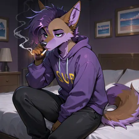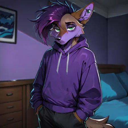 Jay(character), anthro, coyote, brown fur, purple fur, purple hair, Mohawk, green eyes, male, no humans,