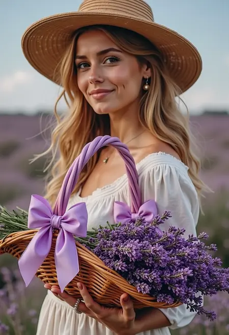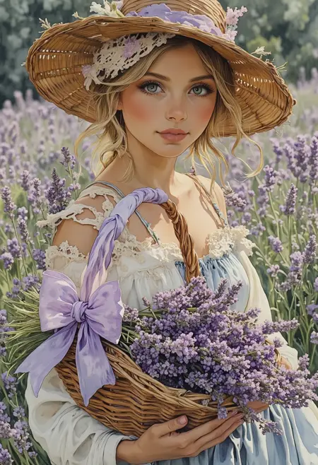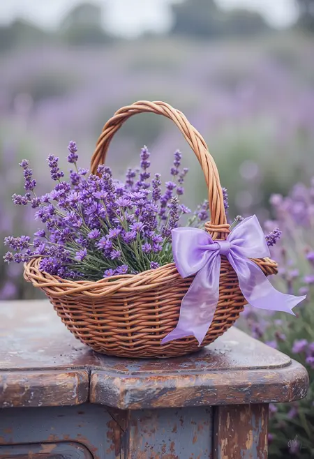 提示:桌上的篮子盛有薰衣草,篮子把手处有透明的紫色蝴蝶结,窗外是花园景色