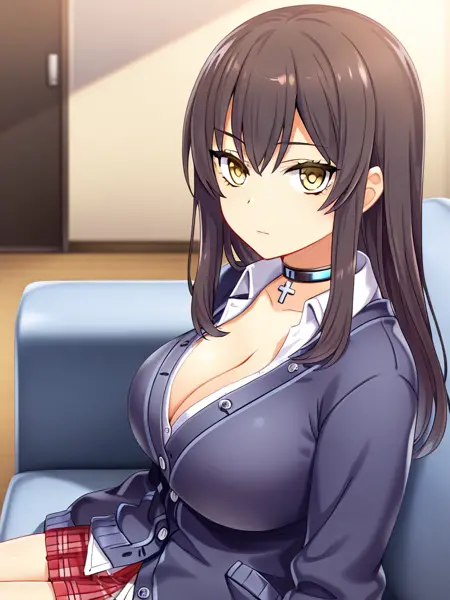 니시자와 시즈쿠, 검은 머리, 긴 머리, 노란 눈, 큰 가슴,