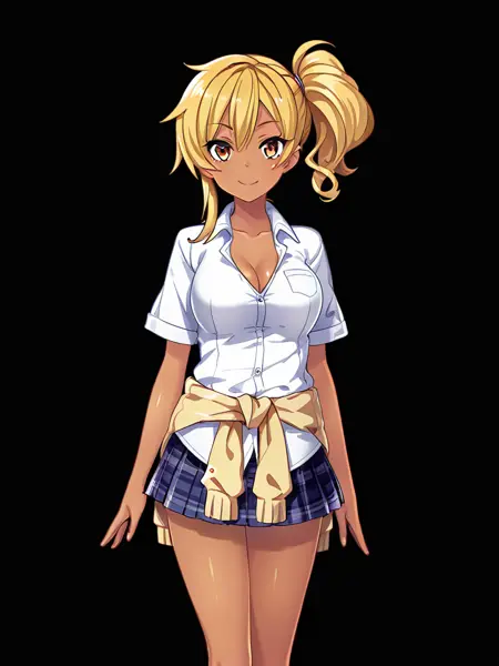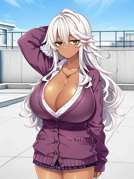 타치바나 리오, 분홍색 머리, 갈색 눈, 검은 피부의 여성, 낮은 트윈테일, 큰 가슴,