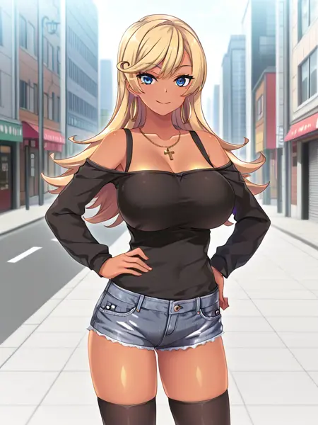 미야모리 하루카, 파란 눈, 긴 머리, 금발, 반쯤 올린 머리, 탄 피부, 큰 가슴,