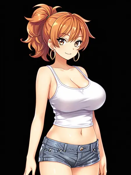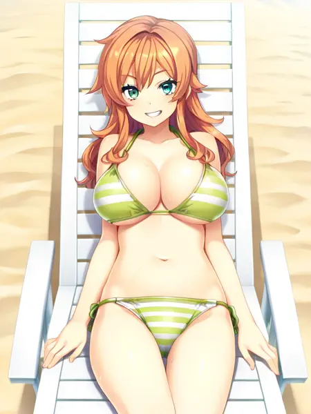 히라카와 나츠미, 녹색 눈, 오렌지색 머리, 긴 머리, 한쪽은 위로 올린 스타일, 머리끈, 큰 가슴,