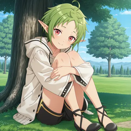 sylphiette, 1girl, red eyes, pointy ears, green hair, short hair,
