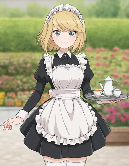 メイドヘアドレス、メイドユニフォーム、黒いドレス、フリル、ふくらはぎ袖、長袖、白いエプロン、背中のリボン、白い太ももハイソックス、黒い靴