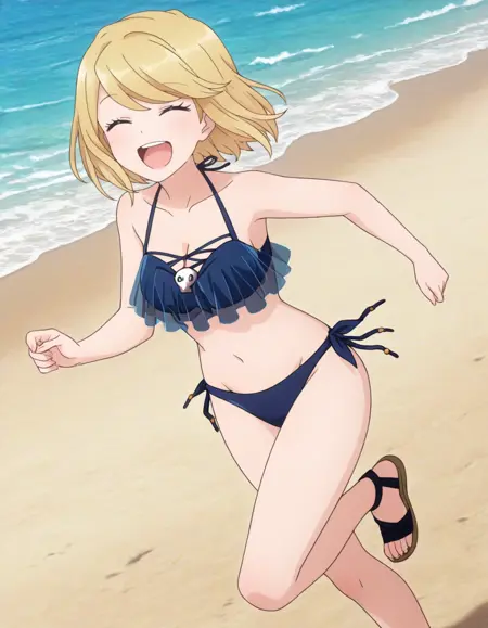 ビキニ、鎖骨、胸元、青いビキニ、スカルオーバー、透けフリル、お腹、へそ、(サイドタイビキニ下:0.7)、サンダル