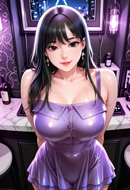 8. ((美丽的无袖紫色连衣裙,美丽的银色耳环,)) 白色手提包,白色蕾丝袜,白色高跟鞋,