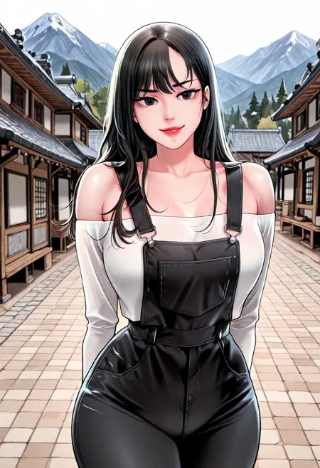 7. ((露肩长袖白色上衣,短腿黑色牛仔背带裤,)) 黑色袜子,