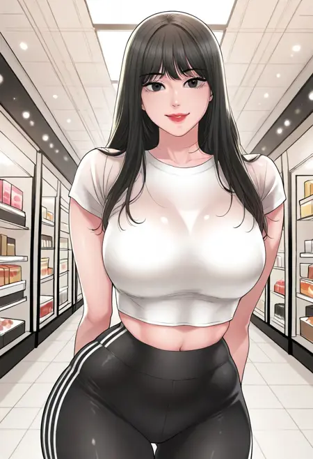 2. ((黑色边缘短袖白色露脐上衣,露腹,侧面有白色条纹的黑色瑜伽裤,))